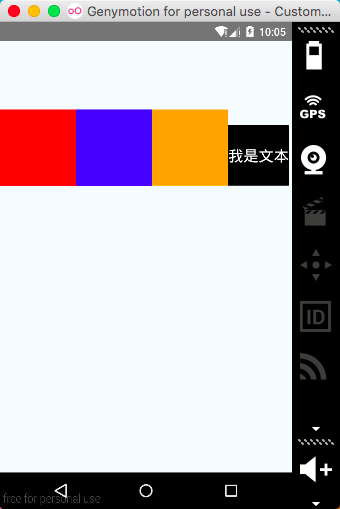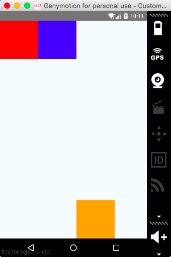 父容器使用flex:1来撑满整个屏幕,orange是固定的一个view,而red与blue使用flex,通过flex的值进行等比(1:2)分摊剩余的空间。来看下运行效果。