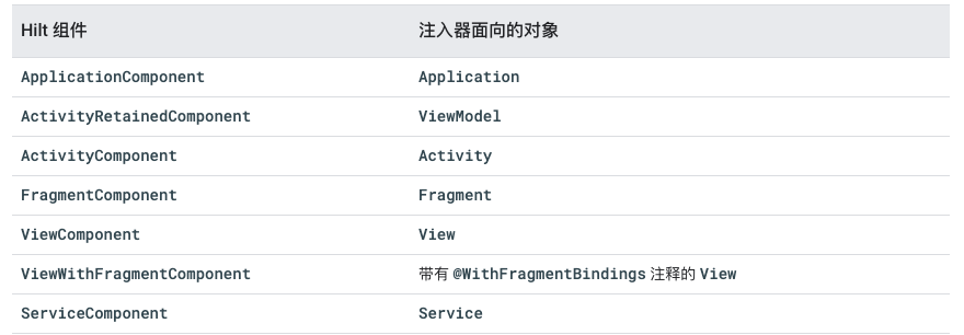 对于之前提到的@InstallIn会关联不同的Android类,除了@ActivityComponent还有以下几种